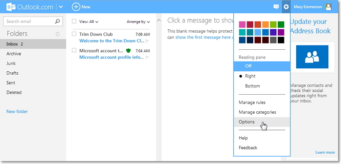 A while ago, Microsoft rebranded their popular Hotmail brand as Outlook; however, they are the same platform. In order to add us to your “Safe Senders” list, first click on the “cog” icon in the top-right corner beside your name. From here, a menu open and you will need to select “Options”.