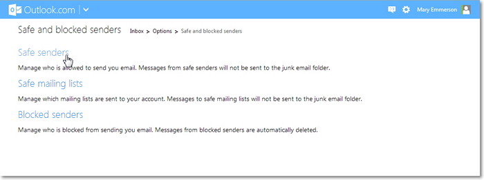 The next step is to click on the “Safe and blocked senders” option in the category called Preventing junk email.