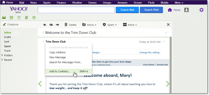 Yahoo! Mail has a quick 2-step process. The first thing you need to do is open our email, and then click on our from name, which is “Trim Down Club”. From here, a short menu will open; please click on the option called “Add to Contacts…”